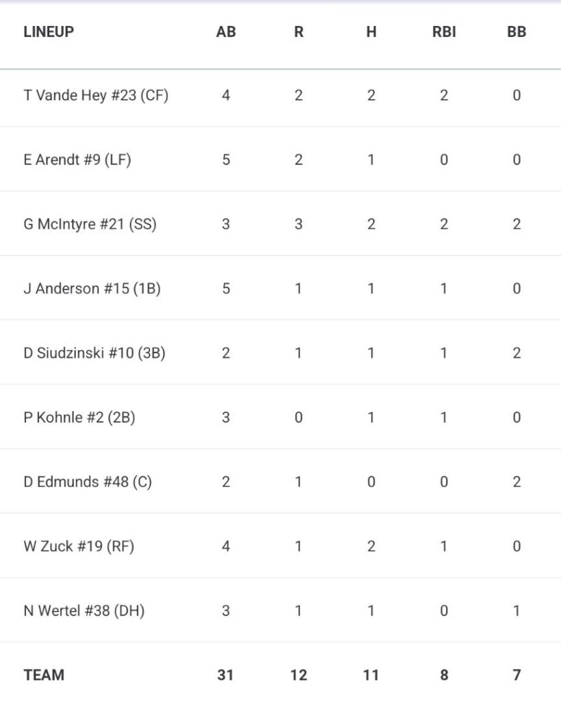 Trevor Vande Hey and Wilson Zuck each finished 2-for-4 with a walk, and Drew Siudzinski reached base three times, with a double and two walks.