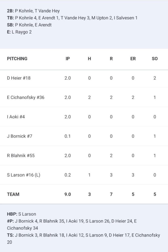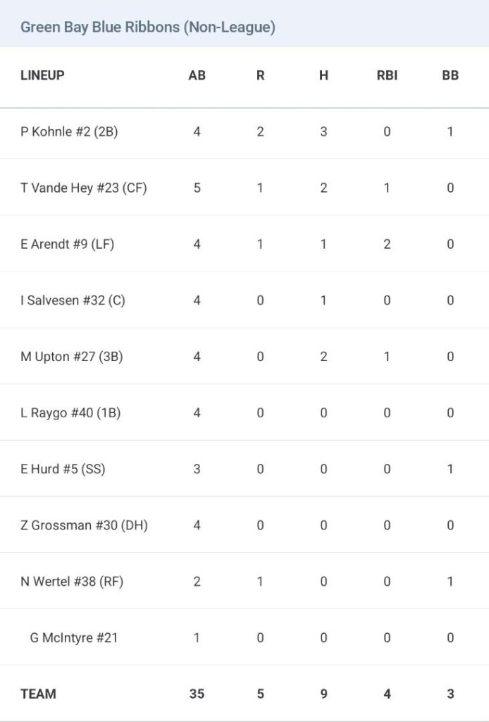 Resting many of their starters, the Blue Ribbons offense was led by several of their few regulars who did see action, including second baseman Payton Kohnle, who went 3-for-4 with a walk, while Trevor Vande Hey and Milo Upton added two hits each.