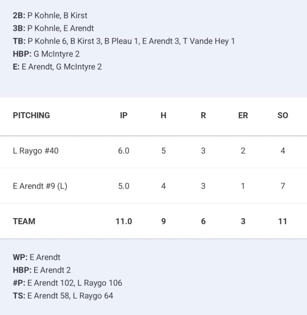 Landon Raygo got the start on the mound and went the first six innings, before giving way to Easton Arendt for the final five.