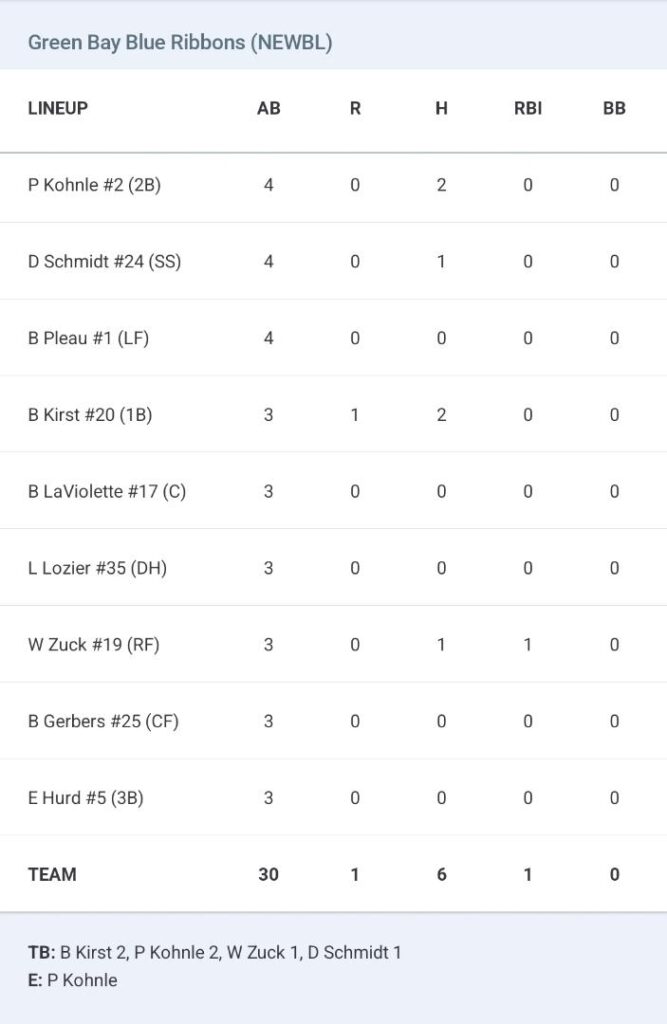 The loss means that barring a major Sheboygan collapse that would involve the A’s dropping their final four NEWBL games, Green Bay will now have to win the NEWBL round robin tournament next week to qualify for the NEWBL Championship series the following week if they hope to defend their NEWBL title.