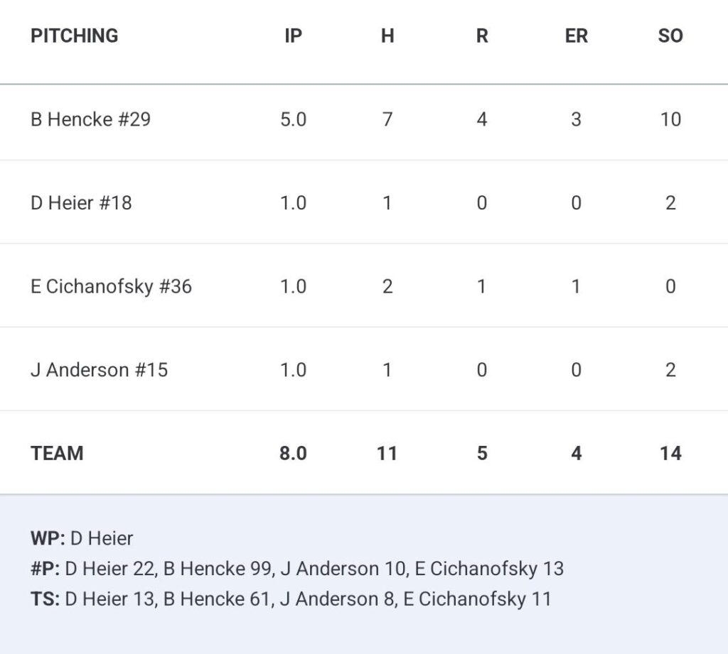 Second baseman Payton Kohnle and first baseman Boone Kirst paced the offense with a pair of hits each, and starting pitcher Benje Hencke struck out ten batters over five innings.