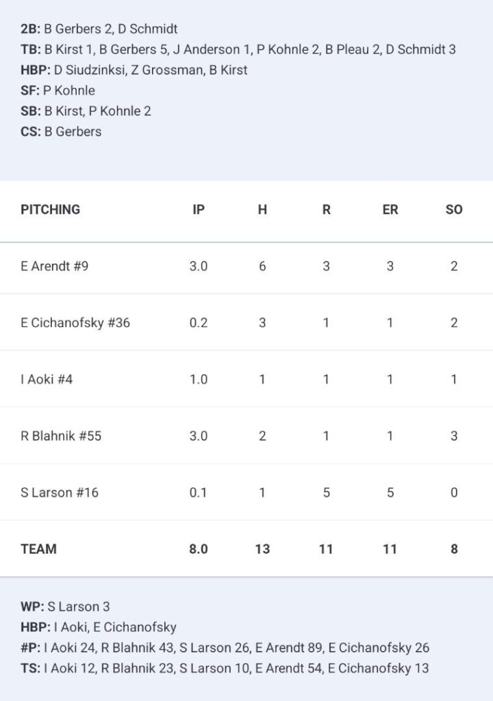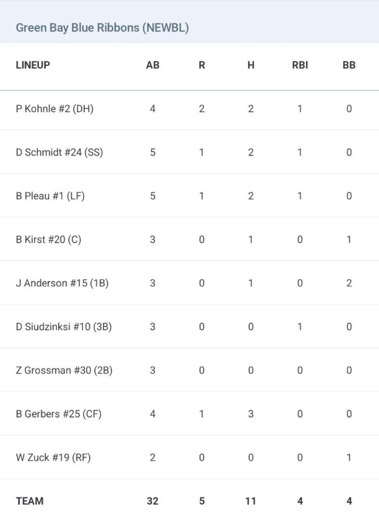 Bryan Gerbers led the offense, going 3-for-4 with a pair of doubles, while Payton Kohnle, Dawson Schmidt and Brayden Pleau added two hits each for Green Bay.