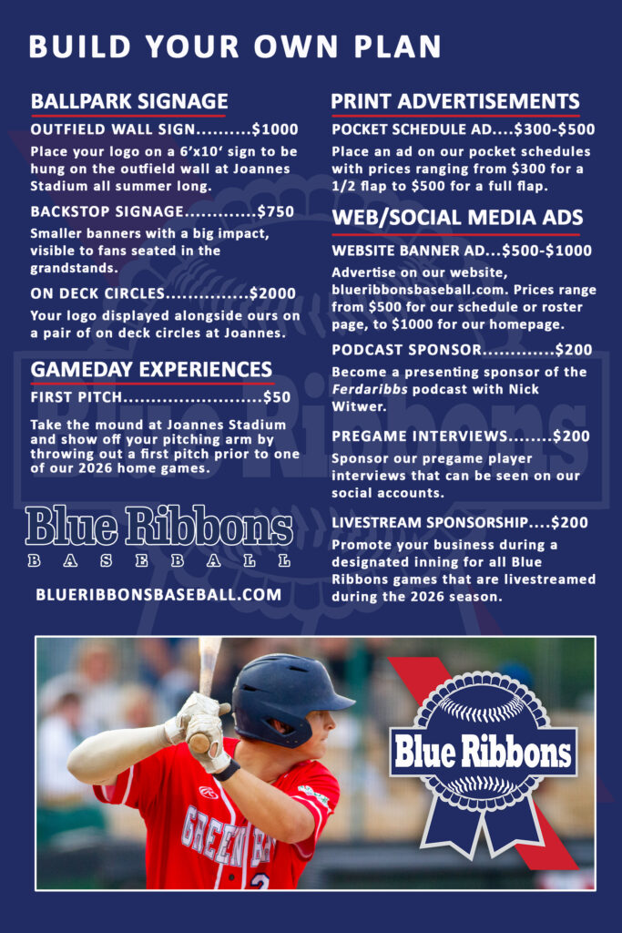 Looking to become a sponsor of Blue Ribbons baseball? We’ve got a variety of options to fit your company’s budget. See the sponsorship handout below for more details.