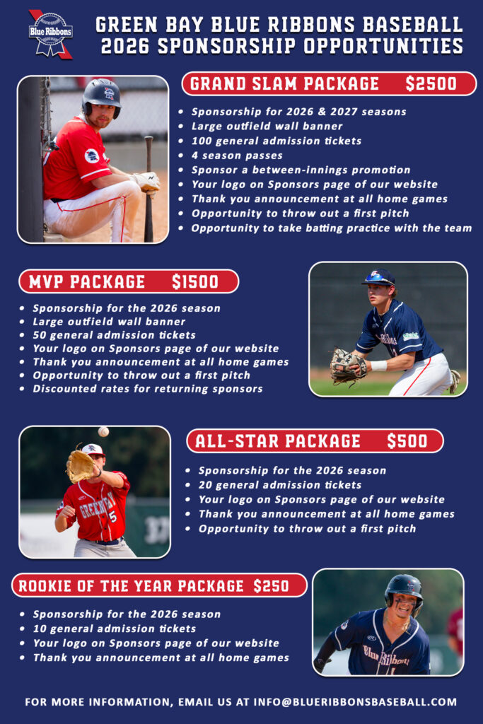 If you would like to become a sponsor of the Green Bay Blue Ribbons, or have any additional questions, please feel free to reach out to us via email at info@blueribbonsbaseball.com
